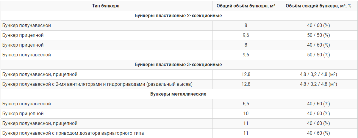 Духсекционные и трёхсекционные, металлические и пластиковые, прицепные и полуприцепные бункеры